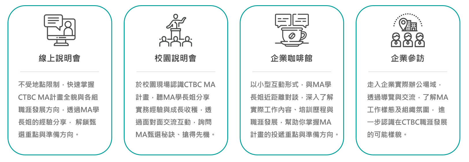 歡迎參考2026年招募活動時程,實際場次及報名資訊請密切追蹤各校網站及CTBC Careers粉絲專頁!