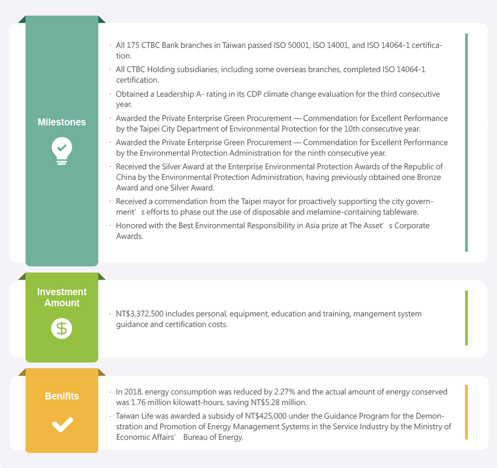 Energy conservation, carbon reduction, and environmental sustainability are core concepts for which the Company continually advocates. CTBC Holding was one of Taiwan's first signatories to the CDP climate change project. It has responded to CDP questionnaires consistently since 2012, and has obtained an A- rating in the leadership evaluation of the Climate Change Questionnaire for three consecutive years since 2016.