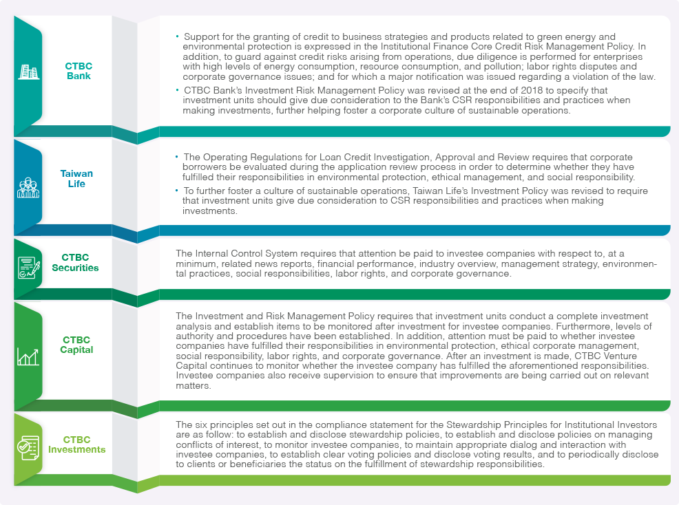 | Operations | Before finalizing an investment in a climate change-sensitive industry, we place particular emphasis on evaluating the environmental, social, and governance aspects of the potential investee company. Through seminars, symposiums, and interviews with upstream and downstream companies and business teams, we strive to understand the industrial and operational impacts of climate change on the potential investee. Investment units consider all such impacts and make an investment decision accordingly. | Environmental protection-related field visits are actively conducted and environmental impact assessment reports are reviewed for domestic industries and large-scale developments that are highly sensitive to environmental risks, thereby ensuring effort in and commitment to projects' environmental friendliness. Regarding our overall operations, long-term climate change risks are reduced by adopting to the Equator Principles, to which we are an EPFI. | At present, when undertaking underwriting, listing, and other business, in addition to reviewing future business conditions, field surveys are also conducted, such as by visiting plants to inspect their actual operating conditions, in order to ensure the Company's fulfillment of due diligence. In the future, investment will be focused on the R&D of climate-related financial products in accordance with industry characteristics and customer demand. | In response to the business opportunities posed by climate change, CTBC Holding has started assessing operations related to climate-related risks, analyzing the degree of impact of climate change on existing customers, carrying out R&D on new forms of insurance that are related to climate change, and improving the method to reduce damages incurred by policyholders from climate change disasters in existing product portfolios. With regard to seeking new opportunities, the recent developments of companies in the same industry and of market demand will be referenced and products such as new forms of weather insurance, agriculture and fisheries insurance, electric vehicle insurance, and more favorable terms for green projects will be launched, thereby increasing the Company's revenue and market share. |
