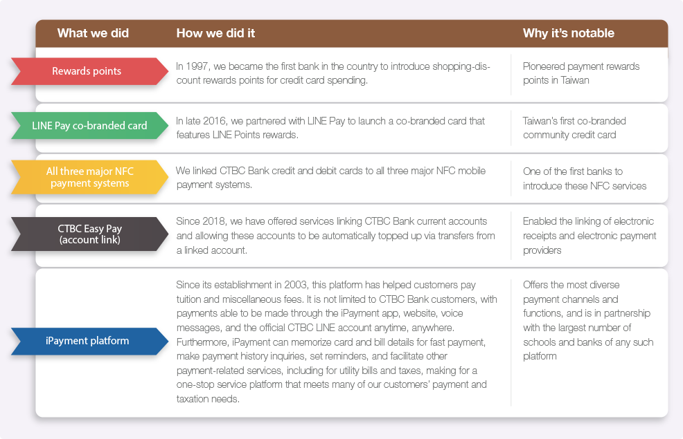 CTBC has adopted a three-pronged strategy comprising digital transformation, digital innovation, and a digital foundation. Powered by the dual engines of banking and insurance, we will continue to launch online and offline digitalization projects and actively engage in digital innovation to provide omni-channel financial services that deliver a consistent financial service experience to customers.