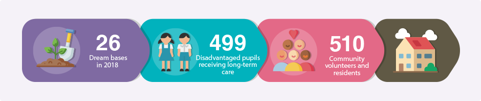 This approach, by leveraging on-the-ground assistance, enables us to turn communities into safe spaces where children's dreams can be nurtured. As of 2018, a total of 26 Taiwan Dream sites had been set up, having cared for 499 children with the assistance of 510 community volunteers.