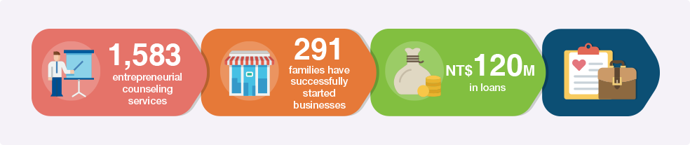 The probram has been provided for more than 1,580 entrepreneurial cases, empowering 291 families to start their own businesses with the support of more than NT$120 million in loans as of 2018 on a cumulative basis. Of these families, 239 remain in business.