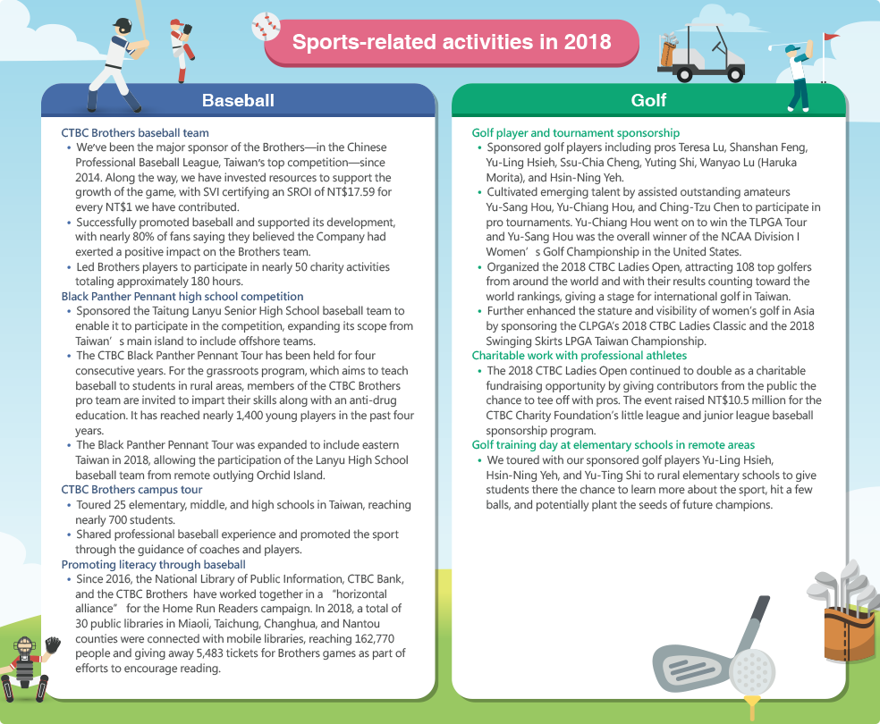 To support the development of Taiwan's national sport, CTBC Holding became the first enterprise to invest in all five levels of baseball, from little league to the pro game. We want the sport to "take root downward and bear fruit upward". By providing sponsorships and organizing events, we are steering the sport from strength to strength. And our sports efforts don't stop with baseball. We also have a long-running relationship with golf, the women's game in particular, helping to nurture and encourage top talent. This support also includes providing sponsorship as well as organizing events, with our tournaments having gone a long way to bringing international-level standards and status to the sport in Taiwan.