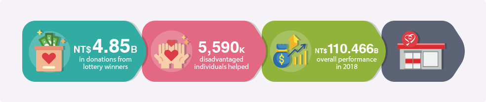 Specifically, between 2007 and 2018, Taiwan Lottery generated earnings of NT$311.164 billion for the government's subsidization of social welfare expenditure, the national pension scheme, and the National Health Insurance program for all counties and municipalities countrywide. Since we took over the management of the charity lottery business in 2007, its total sales have grown from NT$64.2 billion that year to NT$110.466 billion in 2018.