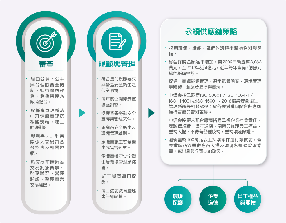 中信金控致力於降低供應鏈所面臨的永續性風險,透過三個主要步驟進行永續性供應鏈管理,針對供應商審查以及供應商規範與管理進行相關要求,並符合中信金控之永續供應鏈策略,同時,透過一連串的管理制度與要求,逐步提升供應鏈之永續性。