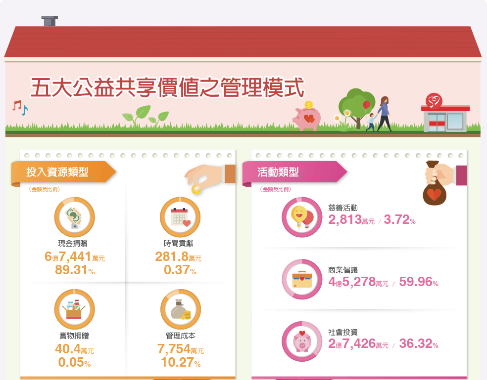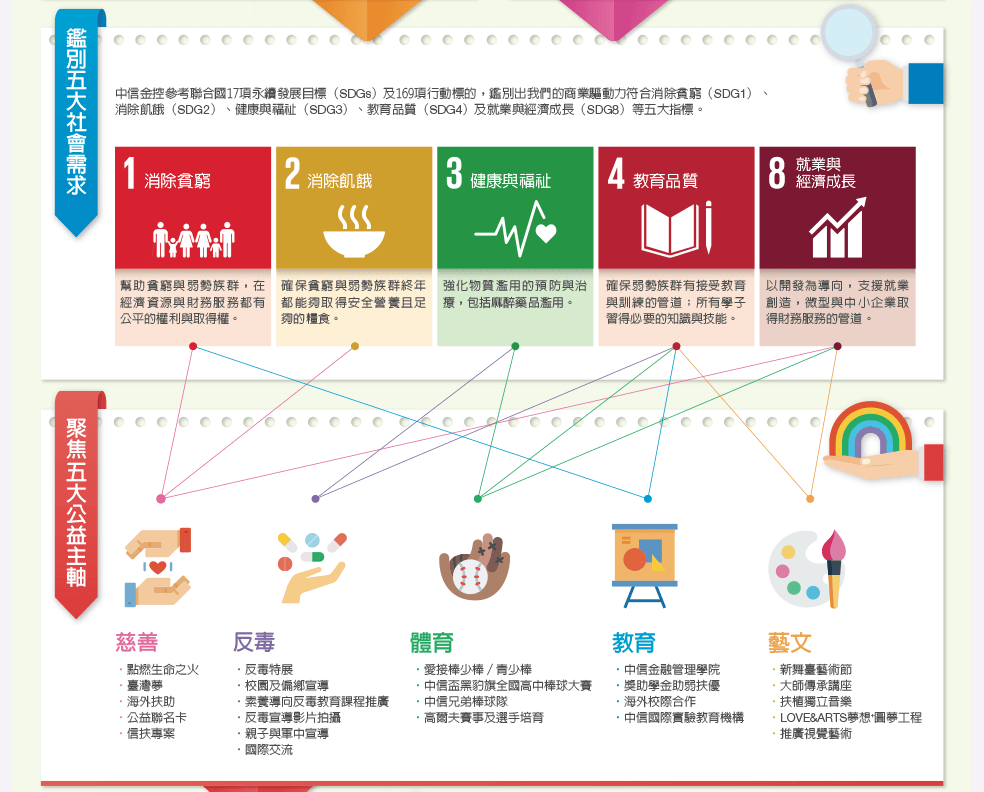 中國信託以「We are family」為經營核心理念,在追求企業獲利成長之際,更重視社會回饋、產生正面影響力,邁向企業與社會共好的永續經營。從全臺灣最早的企業公益愛心募款運動-點燃生命之火,到號召志工投入,近年更發展出慈善、反毒、體育、教育及藝文五大公益主軸,不只「看見需要」,更期盼能「激勵人心」,進而「共同參與」,啟動更多「善的循環」,並像漣漪般不斷擴大,期望每一分公益投入,都能為我們生活的這片土地創造最大正面影響力,擴大愛的循環。