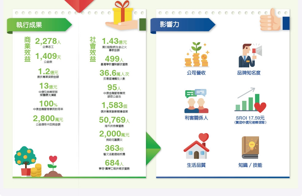 中國信託將推廣藝文公益視為無價的文化投資,致力讓藝術走進大眾生活。中信金控不僅12度獲得「文馨獎」肯定,中國信託文教基金會長期推廣藝文、深耕藝術教育,亦榮獲2018年教育部「藝術教育貢獻獎」、2017教育部「社會教育貢獻獎」殊榮,其中「LOVE&ARTS夢想+圓夢工程」扎根偏鄉藝文教育,導入社會投資報酬率方法學(Social Return on Investment,SROI)研究結果顯示,每投入新臺幣1元,能創造約新臺幣4.18元社會價值,近八成學生提升自我認同感,建立正面價值觀。