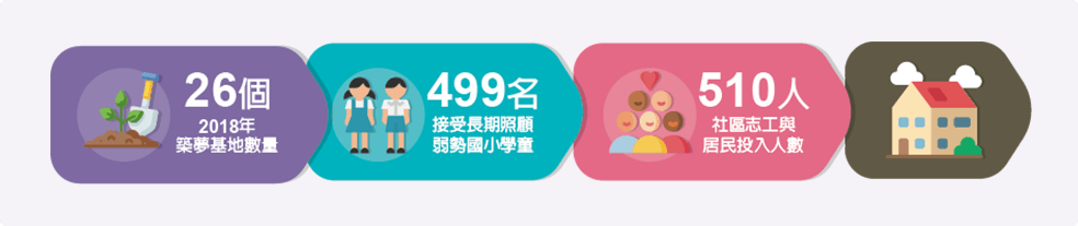 至2018年,共成立26個社區築夢基地,499位孩童獲得照顧、510位社區志工投入計畫,不只將資源挹注至偏遠社區,也動員社區志工攜手努力推行,由公部門與民間企業協力,建構更縝密的兒少社會安全網絡。