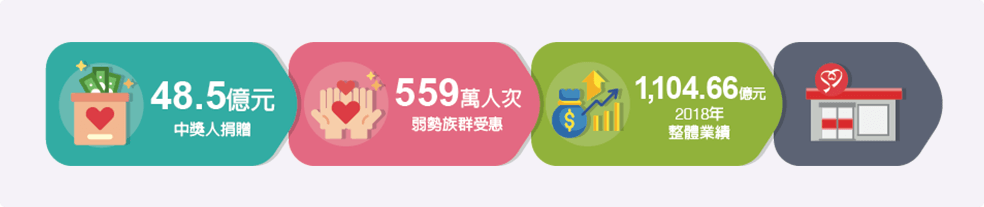從2007年1月起累積至2018年12月底,台灣彩券已為政府創造公益彩券盈餘達新臺幣3,111.64億元,作為補助各縣市政府社會福利支出、國民年金及全民健保。每賣出一張彩券,有8%到10%是彩券經銷商的銷售佣金,這些彩券經銷商都是身心障礙者、原住民或單親低收入戶等弱勢族群,目前全臺約有4萬3,000名彩券經銷商因為販賣公益彩券獲得工作機會,擁有穩定收入。
